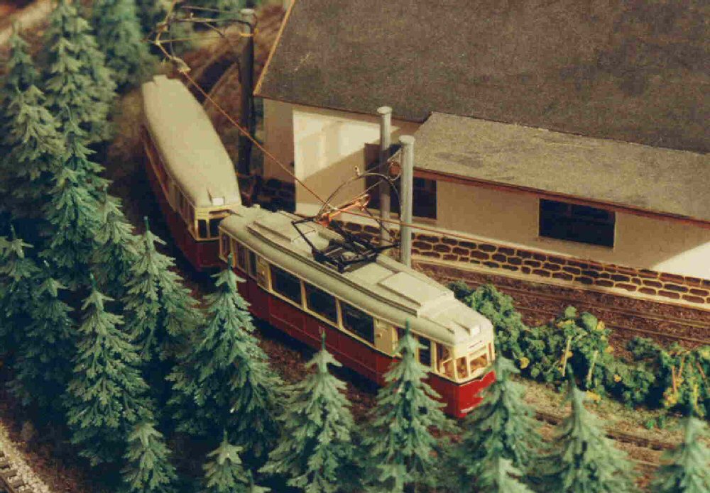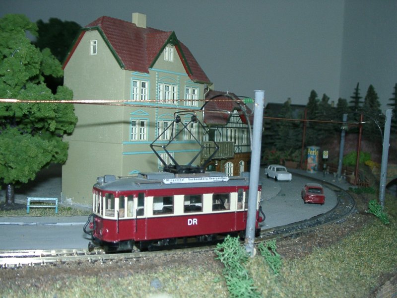 Nach 4 Jahren reifte bei mir der Wunsch, auch eine Straßenbahn zu integrieren. Anfangs reagierte mein Vater ablehnend, aber später fand er zunehmend auch Gefallen an der Idee, wobei die Straßenbahn nach dem Vorbild der Klingenthaler Bahn auch von der Deutschen Reichsbahn betrieben werden sollte. Auch die alten Triebwagen dieser Bahn waren im Blickfeld. Da es ja zu dieser Zeit noch keine handelsüblichen Modelle von Straßenbahnen in der DDR gab, musste alles selbst gebaut werden. Mein Vater baute damals den ET 197 in H0m aus Messingblech selbst, die Fenster wurden einzeln ausgesägt und gefeilt. Auch der Antrieb entstand im Eigenbau. Somit hatte ich dann meine erste Straßenbahn.