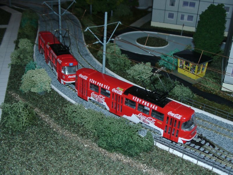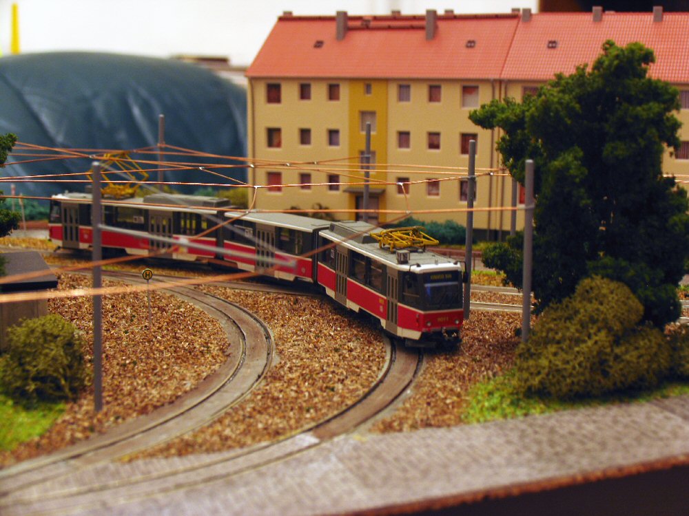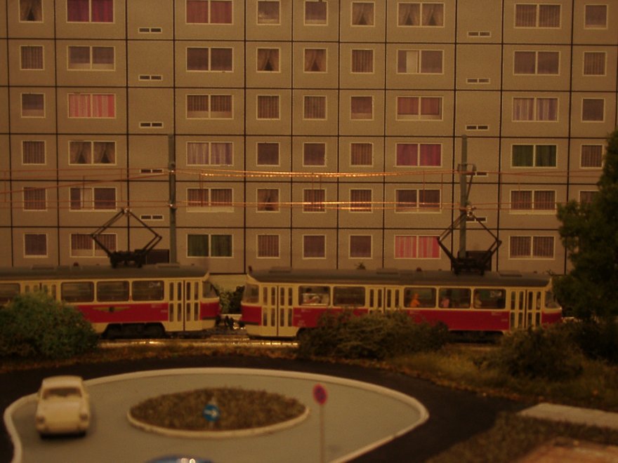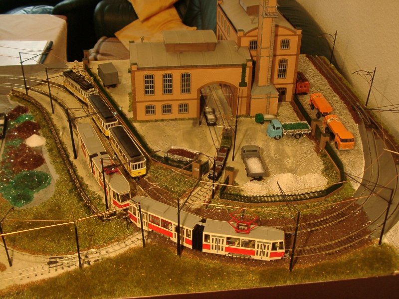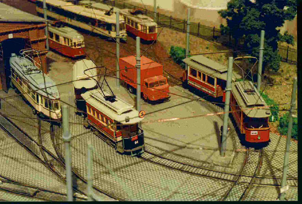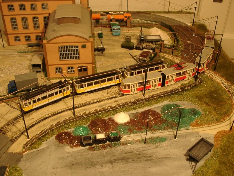 | In den Aufstellgleisen der Schleife stehen der Liberecer T3-Zug (Modell von Rieß) und der KT4D-Prototyp (Eigenumbau aus Herrmann-Teilen) | |