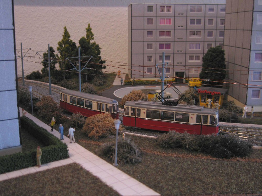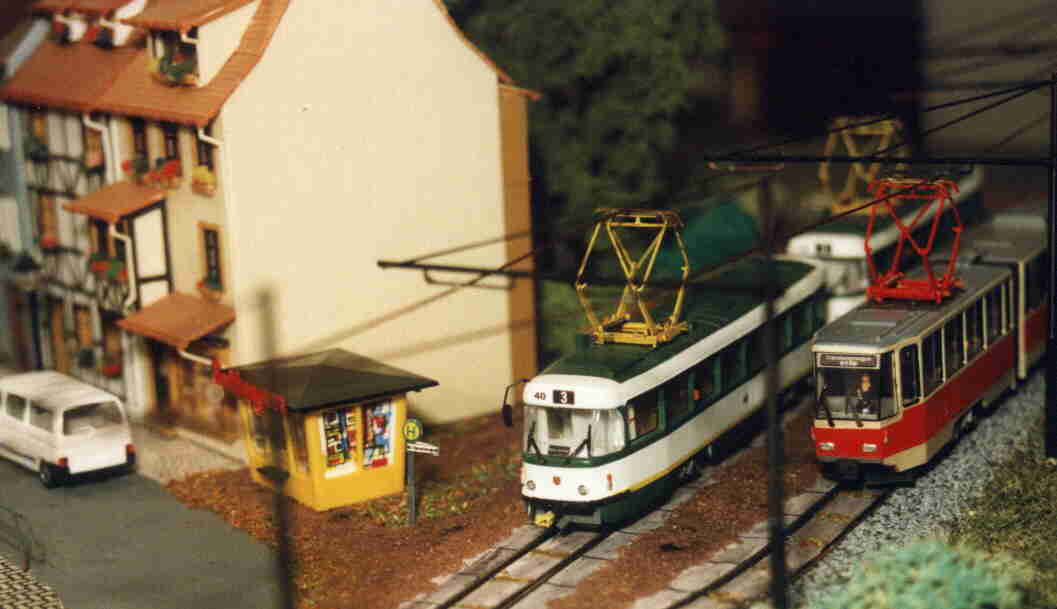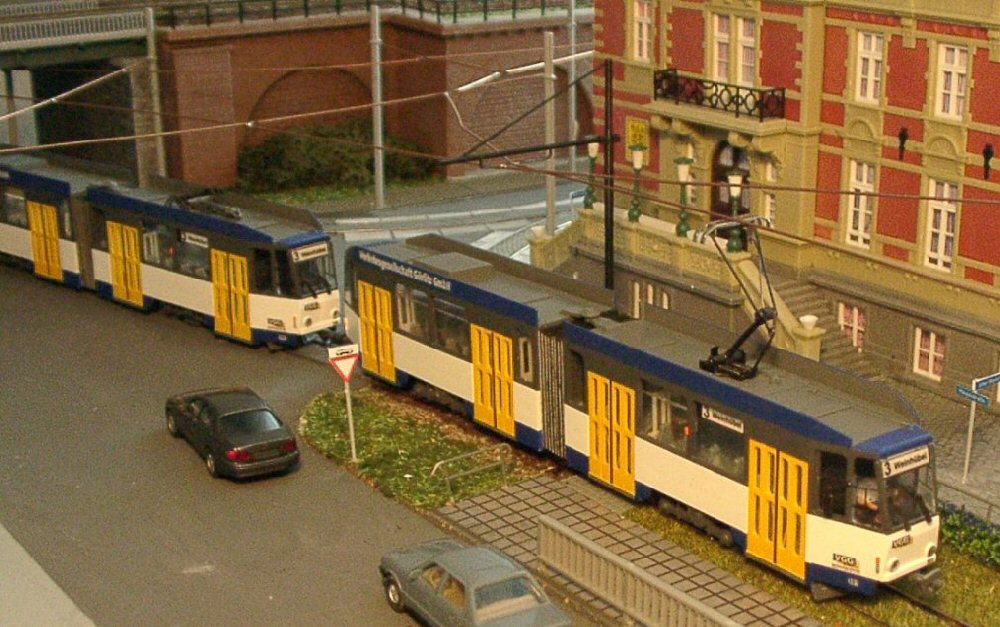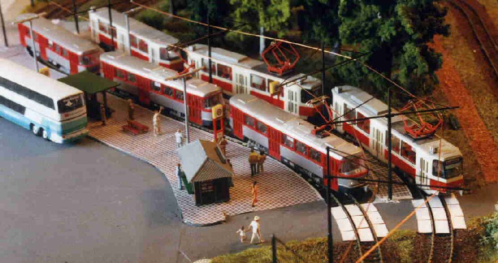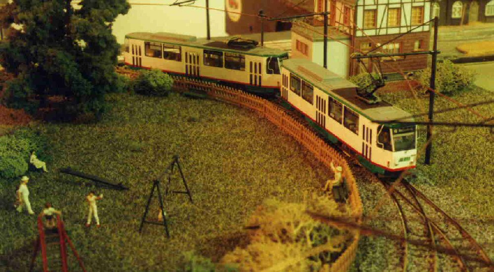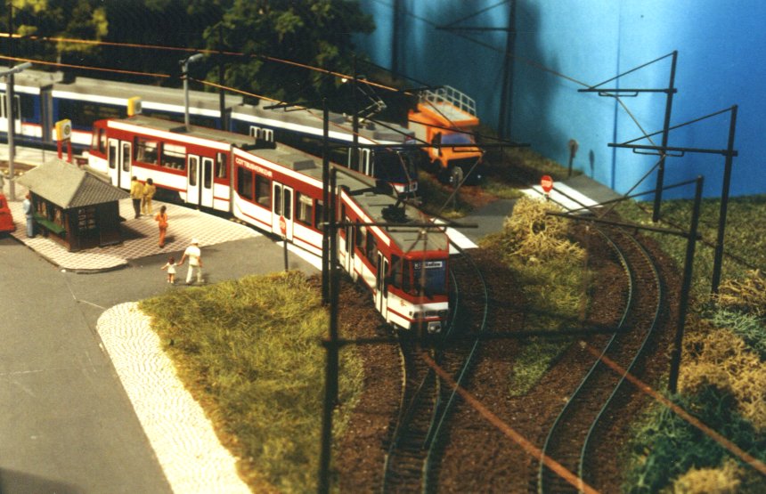 Ein PCC-Zug aus Antwerpen verlässt die Haltestelle Altstadt. Die PCC-Triebwagen sind Messingmodelle aus Belgien, heute leider nicht mehr erhältlich. |