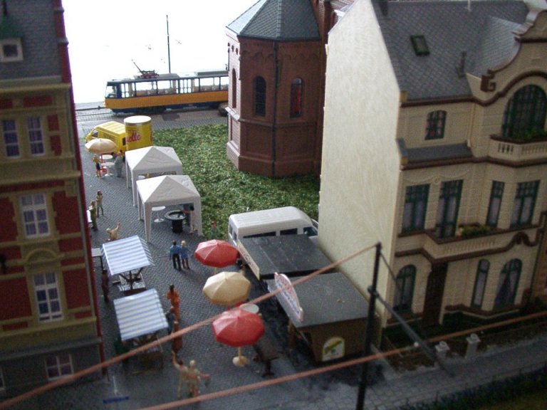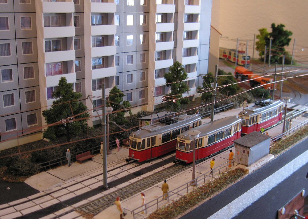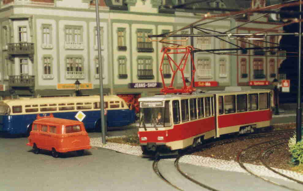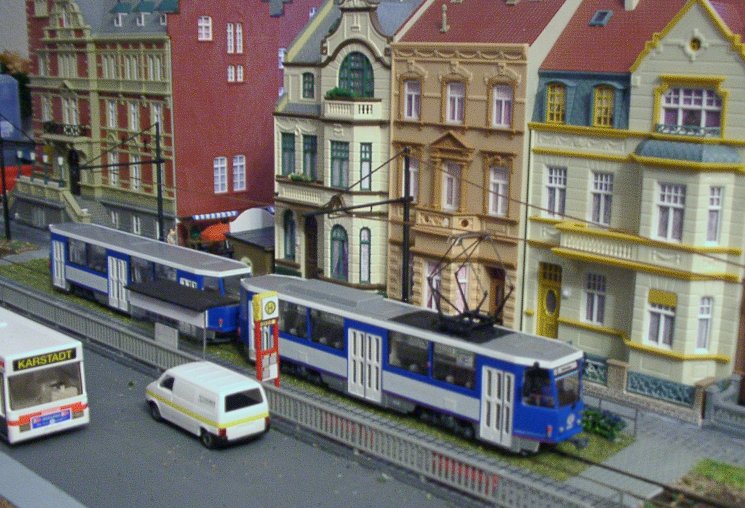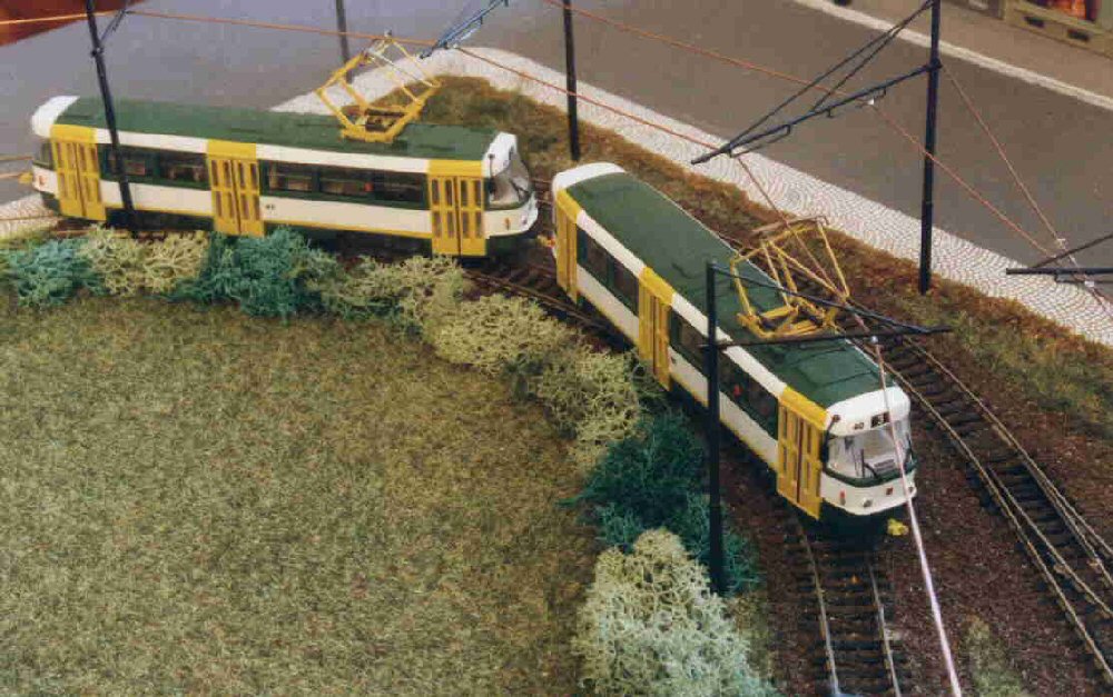 Ein PCC-Zug aus Antwerpen verlässt die Haltestelle Altstadt. Die PCC-Triebwagen sind Messingmodelle aus Belgien, heute leider nicht mehr erhältlich. |