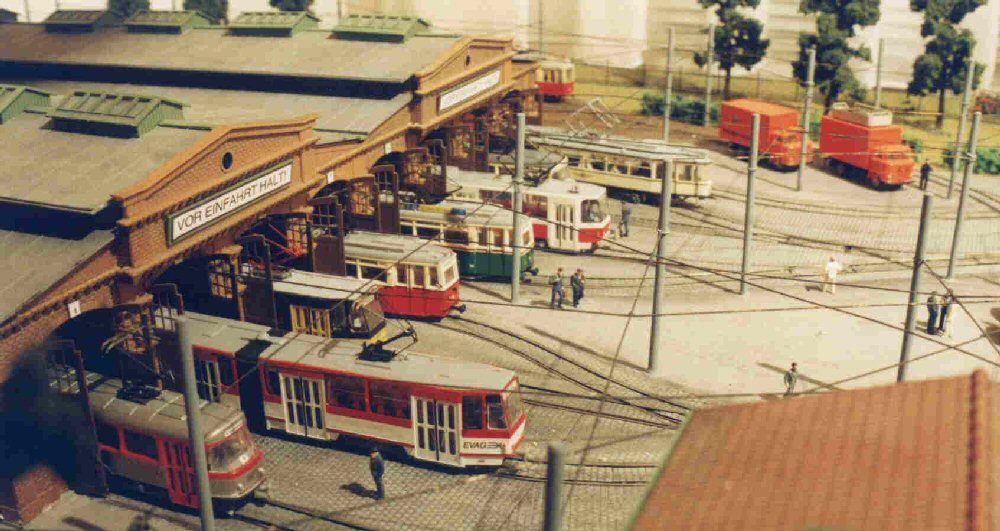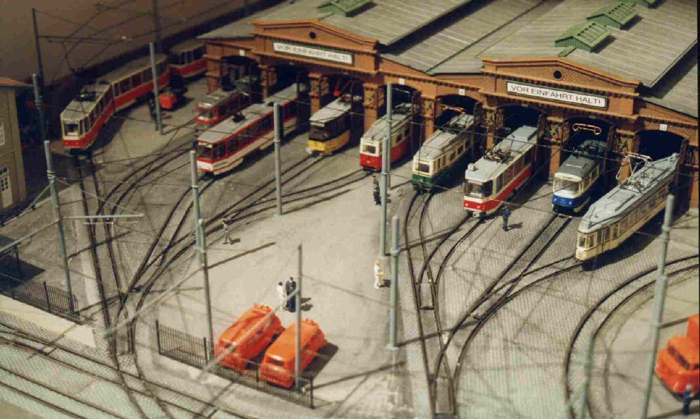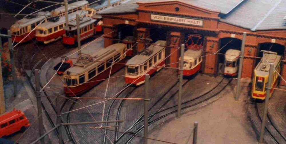 | Das Modul alter Betriebshof war mein erstes Anlagenteil. Hier habe ich 4 POLA-Straßenbahndepots verwendet, so dass ich 8 Hallengleise mit doppelter Nutzlänge zur Verfügung habe. Weiterhin gibt es noch 3 Außengleise und eine Umfahrung mit Ausweichgleis. Die Gleise und Weichen im eingepflasterten Bereich sind im Selbstbau entstanden mit Tillig-Schienenprofilen. |