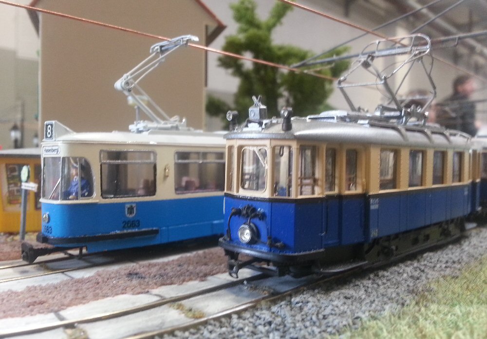 | Blau-weiß regiert hier in den Aufstellgleisen der Wendeschleife. Ein Münchener M5-Zug (Eigenbau) steht neben einem Zug der Wiener Lokalbahn (gesupertes Souvenirmodell von Stängl). | |
