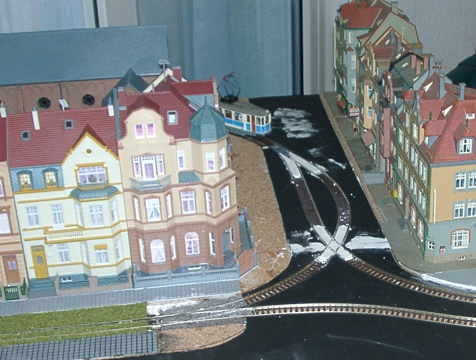 Die Ecke Abzweig ist das Gegenstück zum Glaswerk. Es ist ebenfalls ein Eckmodul. Dargestellt ist ein Abzweig mit vorstädtischer Bebauung. Der KT8 ist ein Rieß-Modell. |