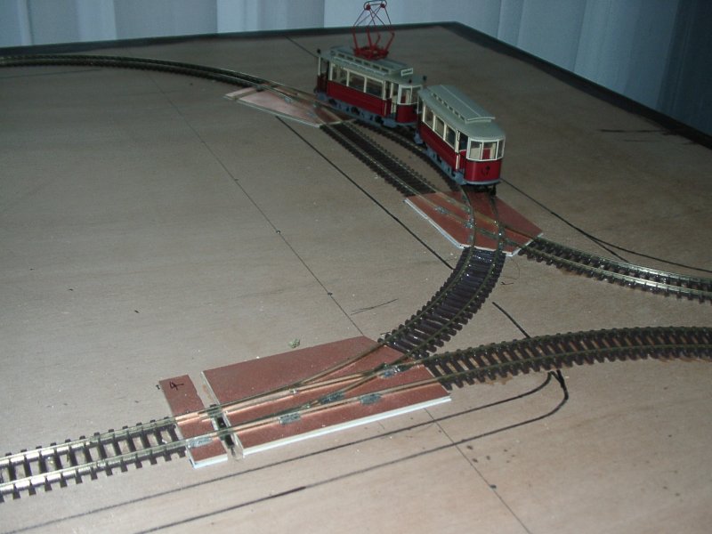 Dann werden die Weichen und Kreuzungen bearbeitet. Das Schienenprofil angelötet. Und erste Probefahrten mit verschiedenen Fahrzeugen durchgeführt. |
