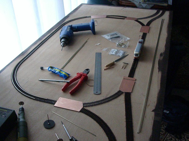 An diesem Anlagenteil möchte ich mal zeigen, wie es entstanden ist. Man kann gut die einzelnen Arbeitsschritte erkennen. Zuerst werden die Schwellenbänder der Gleise aufgeklebt. Ebenso die Leiterplatten für die Weichen. Es wird begonnen, die Schienenprofile in die Schwellenbänder einzuziehen. |