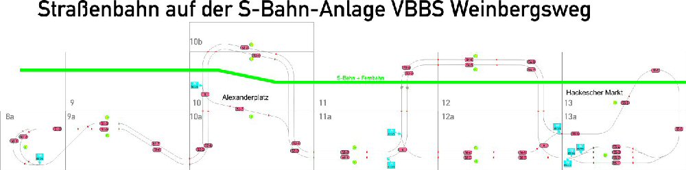 Seit einigen Jahren bin ich Mitglied im VBBS "Weinbergsweg" e.V. und beschäftgie mich dort vorwiegend mit den Belangen der Straßenbahnen auf den Vereinsanlagen. Zuerst genannt sei dabei die Berliner-S-Bahn Anlage, nachgebaut wurde dabei der Teil der Stadtbahn zwischen Berlin-Ostbahnhof und Hackescher Markt mit dem Alexanderplatz und dem Fernsehturm. Unsere H0-Straßenbahnen fahren digital im echten Oberleitungsbetrieb. S-Bahn-Anlage |