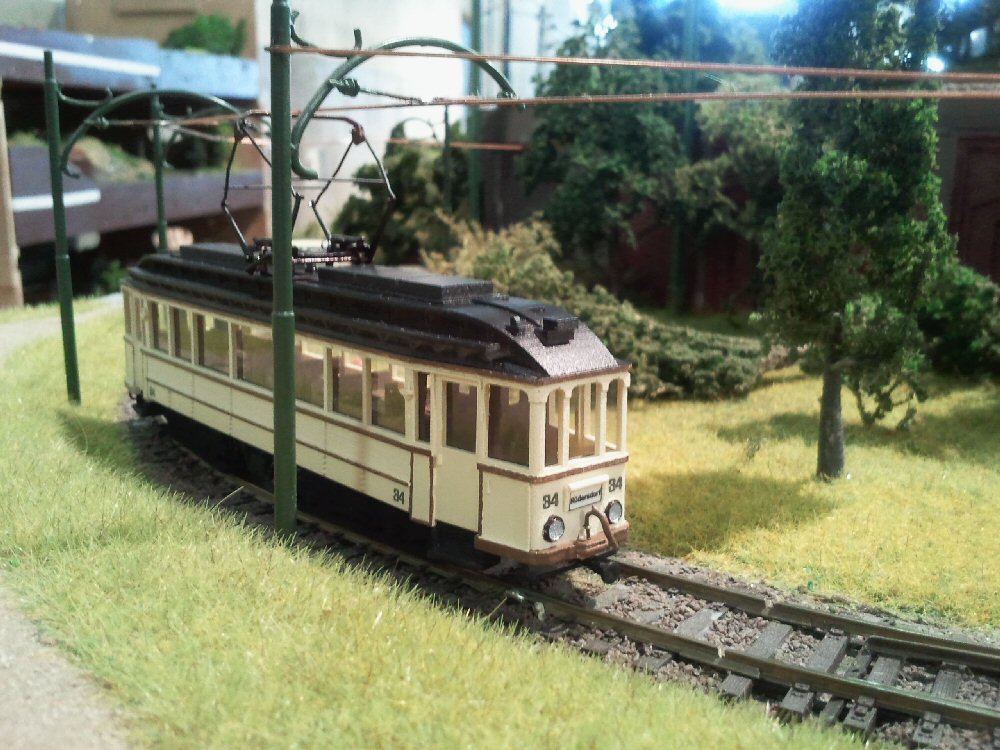 | Schöneiche Tw 34 zählt zu den Stammfahrzeugen auf diesem Anlagenteil. Er entstand aus einem 3D-Druck-Modell von Guido Mandorf. | |