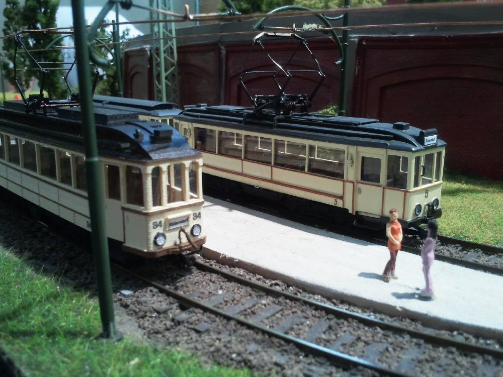 | Die beiden Schöneicher Tw 5 und Tw 34 an der Ausweichstelle. Der Tw 5 mit Beiwagen ist ein Eigenbaumodell eines früheren Vereinsmitgliedes. |