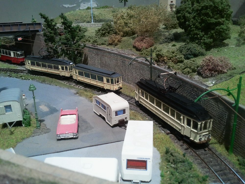 | Alle Schöneicher Modelle auf einem Bild... Tw 65 unter der Brücke, Tw 5 mit Beiwagen und Tw 34 folgt. Tw 65 ist ein Eigenbaumodell aus Halling-Reko-Teilen. |