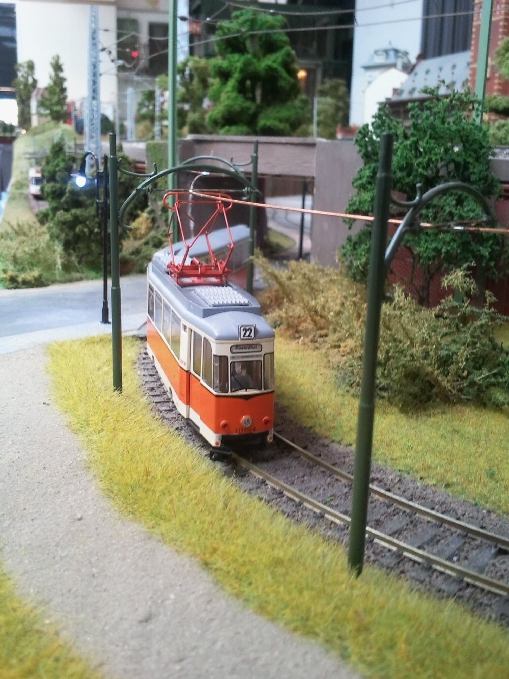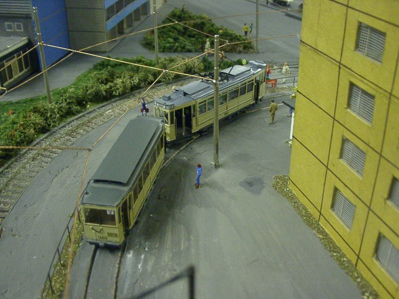 Die Straßenbahn auf der Modulanlage Hier wurde eine Kleinstadt mit einer Ringlinie dargestellt, wobei kein konkretes Vorbild Pate gestanden hat. |