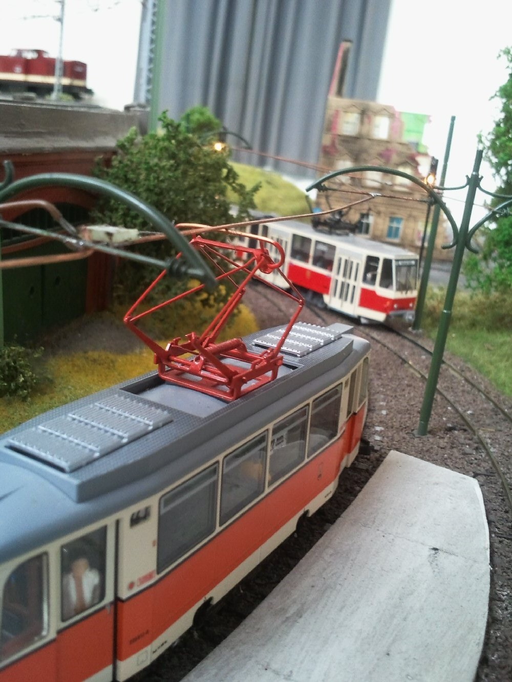 Oft auf der Modulanlage anzutreffen ist auch der Verbundzug aus zwei Leipziger Tw des Typs 29. In Leipzig gab es diese Zugformation nur selten bei Pendelverkehren. Eher bekannt sind diese aus Strausberg. Die Modelle sind eine Kleinserie. Ursprünglich entstand das Urmodell gefräst aus Kunststoff von Bodo-Lutz Schmidt. |