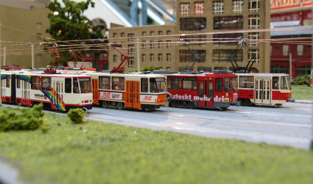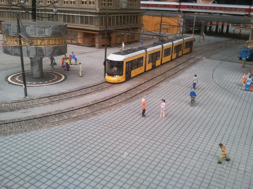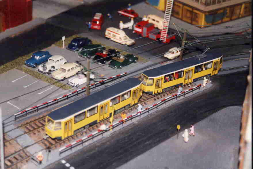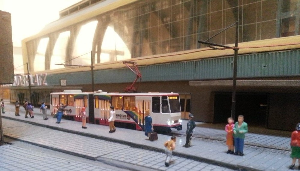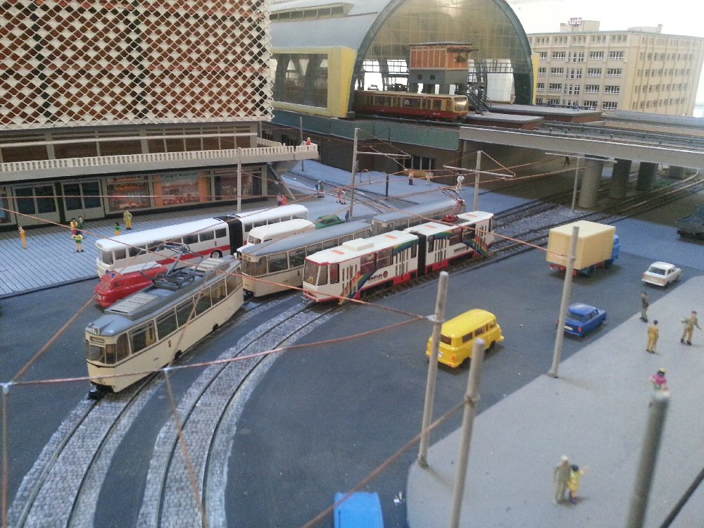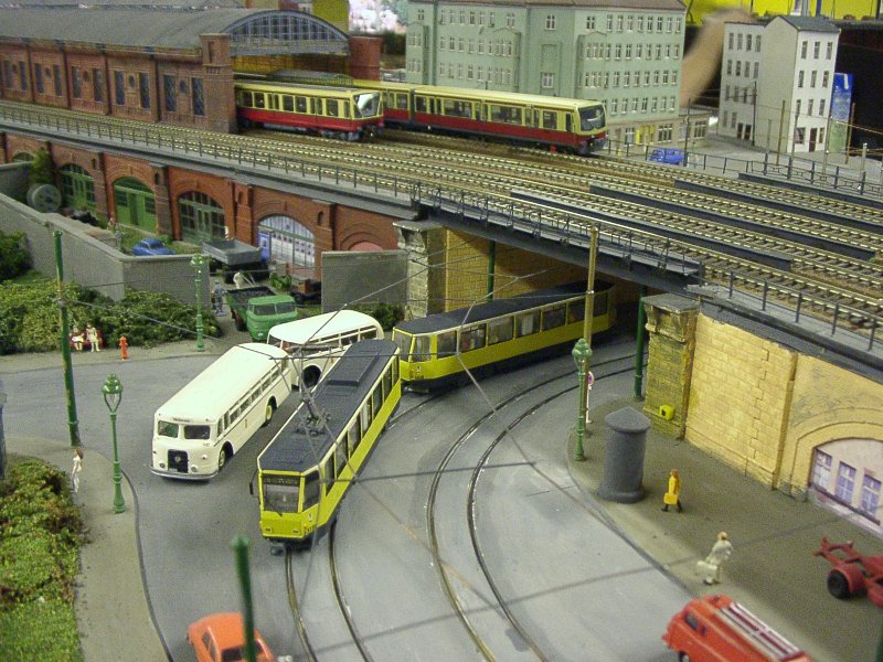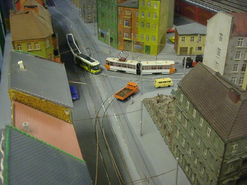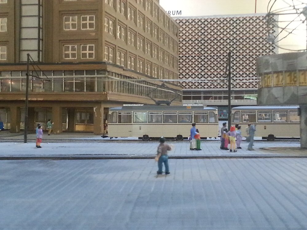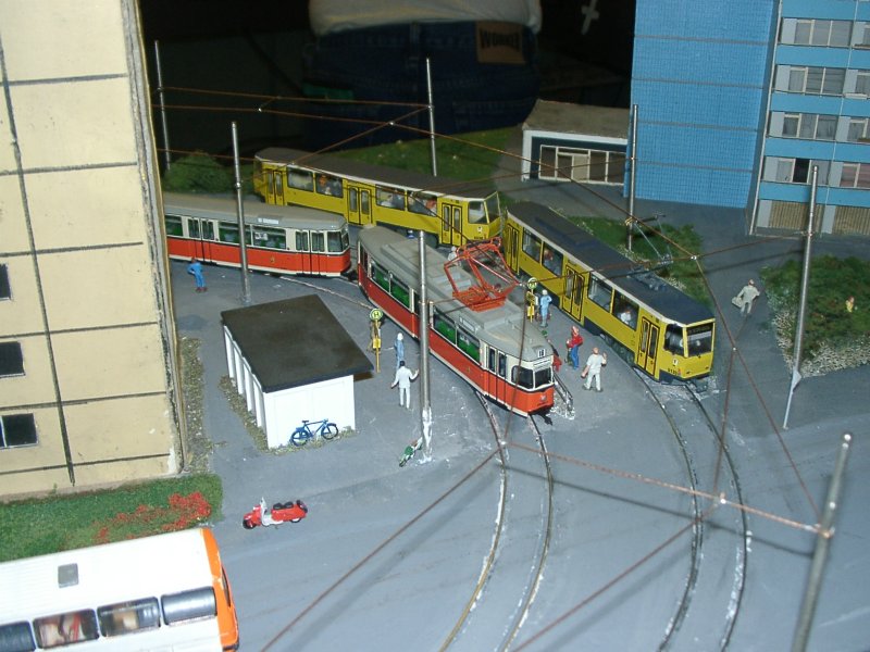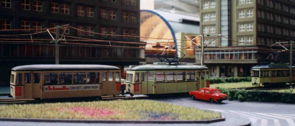 | Ein "Stube-und-Küche" Wagen und ein "Panzerzug" kreuzen auf dem alten Alexanderplatz. Auch bei uns auf der Anlage wurde der Alexanderplatz 2005 zur Fußgängerzone umgebaut. Bis dahin haben wir den Zustand der 60er Jahre dargestellt. | |
