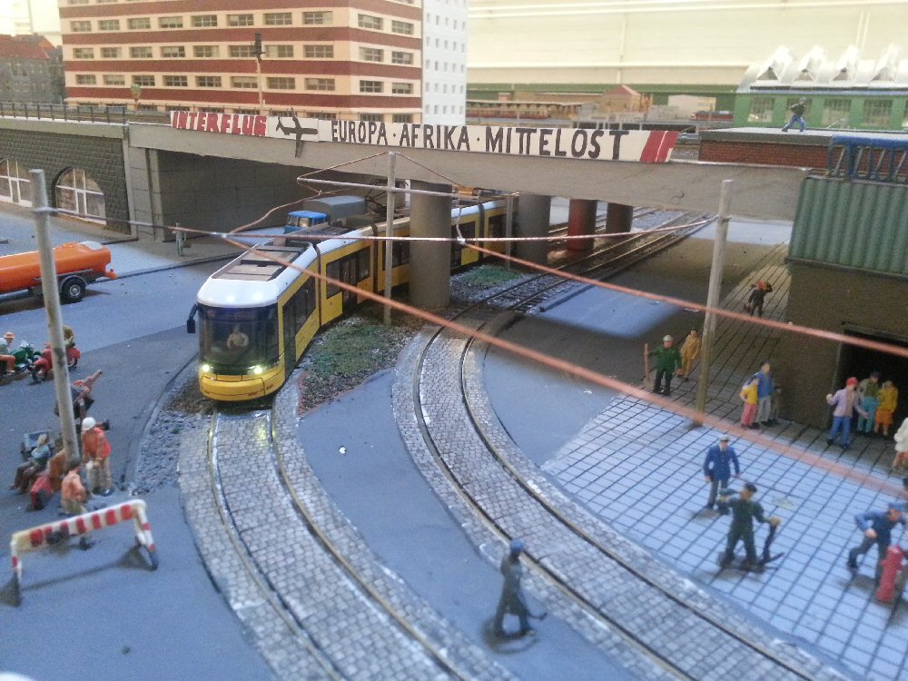| Der Flexity Berlin unterquert die S-Bahn auf der Karl-Liebknecht-Str., um gleich in die Gontardstr. einzubiegen. Im Original ist die Gleisführung hier anders, aber wir mussten wegen der räumlichen Gegebenheiten Kompromisse machen. |