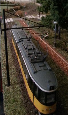 Wer es filigraner haben will, kann dünneren Draht nehmen, muß dann aber auch mit speziellen Fahrdrahthängern (z.B. Sedlacek oder Swedtram) arbeiten. Diese Hänger gibt es dann auch für Rollenstromabnehmerbetrieb. Diese Art der Oberleitung sieht natürlich besser aus, ist aber arbeitsaufwändiger und empfindlicher im Betrieb. Wichtig ist noch die Fahrdrahthöhe auf der Modellanlage. Hier sollte man sich wieder Lehren bauen. Wenn man nicht gerade mit Doppelstockstraßenbahnen fahren will, ist eine Höhe von 55-65mm für H0 üblich. Bei der Verwendung der Sommerfeldt-Fahrdrähte sollte man diese nach den Probefahrten mit dunkelgrauer/anthrazit/schwarzer Farbe anstreichen.
